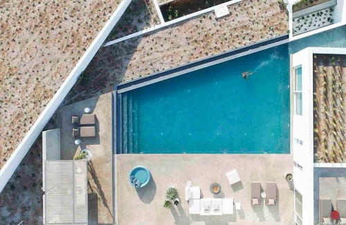 the alfresco areas of villa echo capture the essence of the greek summer, with a heated swimming pool inviting guests to relax and enjoy refreshing dips while savoring a mocktail The dining area provides a shaded retreat to enjoy island delicacies, while a smaller swimming pool on the upper level offers intimate moments under the Greek sun.