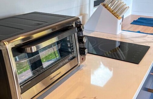the kitchen includes a mini-fridge with small freezer space, a two-burner hot top, dishwasher, coffee/latte maker, and ice maker The kitchen is fully stocked with glassware, utensils, barware, paper products, cleaning supplies, and your basic cooking ingredients (olive oil, S/P, coffee, sugar.)