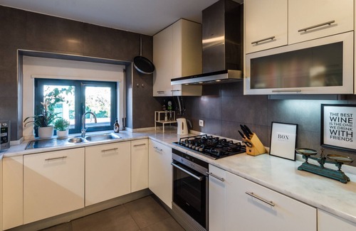 The house is built over 3 floors. On the ground floor we have the living and dining room, kitchen, office, guest toilet, garden and swimming pool. On the first floor we have 2 double bedrooms (one en suite) and 2 bathrooms. On the second floor we find a small living room, 2 double bedrooms and 1 bathroom. Bed lining and towels are provided, as well as cable TV and WiFi. The kitchen it's fully equipped (laundry and washing machine, microwave, oven, toaster, expresso machine, and kettle)..