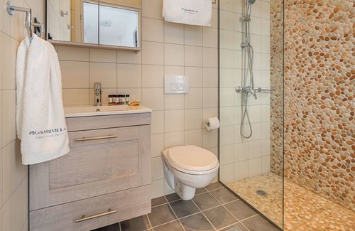 the master bedroom has en-suite bathroom with shower, decorated with traditional and modern tiles The second bathroom has natural pebbles in the shower, giving you the sense that you're a part of the surrounding nature.