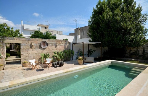 In the historic center of a small village in Puglia just 4 km from the sea of the picturesque port of Castro Marina, on the Adriatic side of the Salento peninsula, there is this beautiful villa with swimming pool with a typically Mediterranean flavor and an unmistakably international taste. A skilful restoration has kept the architectural features of the buildings in the area unchanged, while the furniture and decor are a mix between contemporary, ethnic and typical of popular houses in southern Italy, with that air of old crafts and sunny afternoons of summer, where the smell of homemade tomato sauce lingers in the alleys.