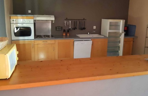 the kitchen is equipped with an oven, a stovetop, and a refrigerator, as well as a coffee maker, an electric kettle, and a microwave And you won't have to pack extra clothes, because you'll also have a washing machine. Other amenities include a sofa bed, bed sheets, an ironing board, and heating.