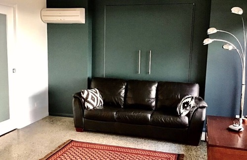 comfortably sleeping 6 people in 3 queen-sized beds including a wall-bed in the sitting room No need to fight over the bathroom, downstairs there is a large main bathroom and en-suite and upstairs a luxurious en-suite off the master bedroom. The kitchen has a wall oven and convection/microwave oven plus a well-stocked pantry so you can prepare a feast or, for more informal dining, cook up a barbie or order take-away. The separate laundry has a washing machine only.