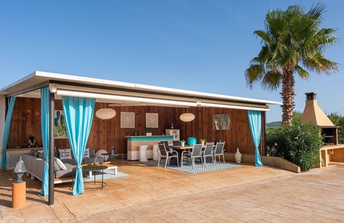 this is a stunning, spacious, ibicencan-modern villa with spectacular views to the mountains and to the sea ideally situated close to the airport, the best beaches of the island and ibiza town It has got a beautiful and well cared garden and a 62sqm private swimming pool with Jacuzzi and an amazing 160 m2 top roof terrace with chillout area.