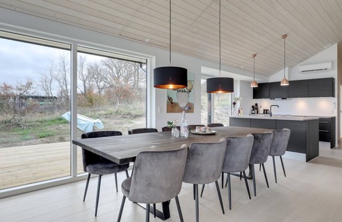Single-family house, built in 2023. 200 m from the sea. Private: natural state property 1'200 m2. Outdoor shower, terrace (150 m2), barbecue. In the house: sauna, washing machine, tumble dryer. Parking at the house. E-charging station. Grocery 800 m. Golf course 8.1 km. The owner does not accept any youth groups.
