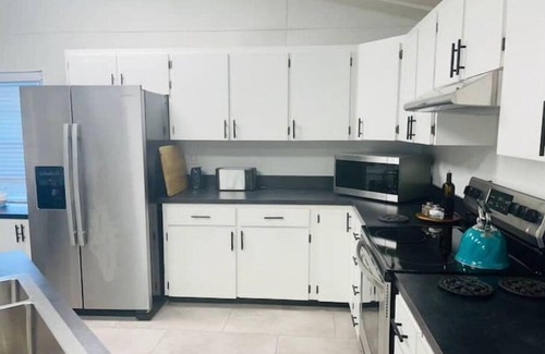 full updated kitchen with all the ammenities of home (pots, pans, blender, stainless steel appliances including dishwasher & more) with a lovely coffee bar tv rm, family activity rm, and screen rm