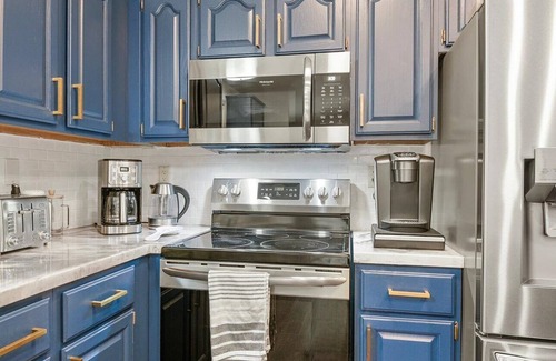 the house boasts four bedrooms, three baths, a game room, and dedicated workspaces, catering to families, friends, or couples seeking a peaceful escape The fully equipped open kitchen has modern appliances including starter condiments.
