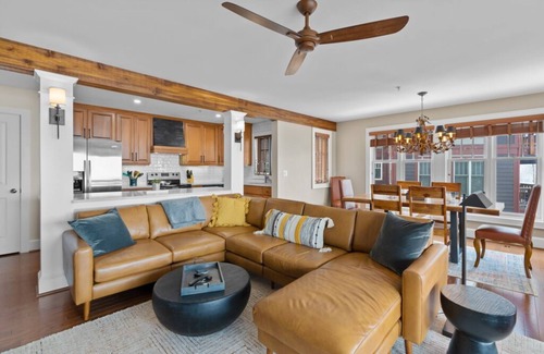 the open concept living area is tastefully furnished, providing a cozy ambiance for relaxation or socializing The large windows showcase the awe-inspiring views of the surrounding mountains. There is a modern, fully equipped kitchen with all you need to prepare delicious meals. There is a cozy, gas-burning stone fireplace with remote control. A washer and dryer are available in the unit.