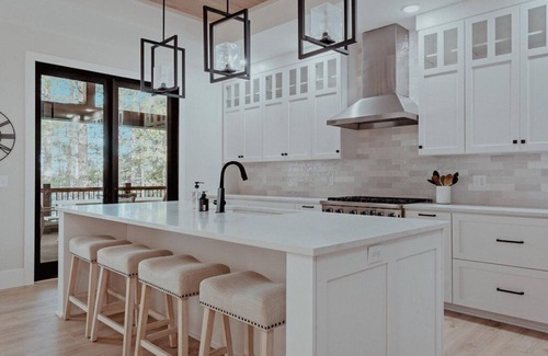 start your mornings with coffee and breakfast in the spacious kitchen or take it outside to the covered porch, where you'll find another wood-burning fireplace, comfortable seating, and a tv for entertainment while you enjoy the view If you love to cook, the fully stocked butler's kitchen with Viking appliances will make meal prep a breeze. And don’t forget to grab a drink from the built-in bar on the main level—whether it’s a mocktail or a cocktail, it’s the perfect way to unwind after a busy day.