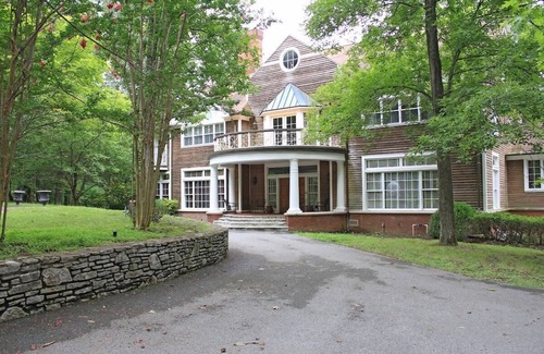 the whole group will be comfortable in this spacious and unique 4-bedroom apartment within this grand mansion-in-the-woods Hiking trails are right outside your door. Huge kitchen and dining room. Large entertainment room with bar. Walk down to the hidden pond and out on the dock for fishing or continue further down through Peach Orchard Hollow to an organic farm and sweet animals. This apartment is on the second floor of a huge mansion in a 3000 acre hardwood forest..