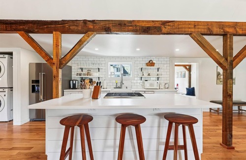 this unique vermont barn-turned-home has been beautifully thought out and offers a warm welcome from the moment you enter Rustic and modern elements blend smoothly throughout, and careful thought has been put into comfortable spaces and furnishings. Natural elements such as warm wood flooring and hand-hewn beams are found throughout the home. The open floor plan features a bright white kitchen with subway tile backsplash and all new appliances. An adjacent dining area features built in banquette seating and sliding door access to the deck. The raised wood stove providing warmth and ambiance is the focal point of the sitting area, while the TV and a plush and cozy couch beg for movie night in the living area.