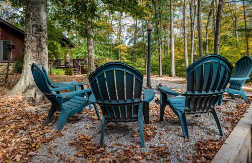 many hours of your stay will be spent on the wrap around deck indulging in the simple pleasure of nature that abounds on the property The hot tub is perfect for late night soaking and star gazing. There is also a seasonal outdoor shower overlooking the woods. Take time to explore the pond and the many acres of woods. Get your competitive juices flowing at the horseshoe pit or have a relaxing lunch using the charcoal grill and picnic table right outside your back door. In the evening, roast some marshmallows around the campfire pit while you share stories of the day's events. a perfect end to a perfect day!