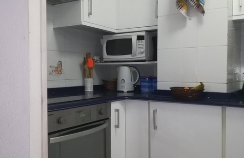 it has a complete bathroom, with shower and bidet, with exterior window and a kitchen open to the living room and very well equipped hallway of household appliances, cutlery, crockery, pots and fast dishes for cooking, oven, microwave, etc ...