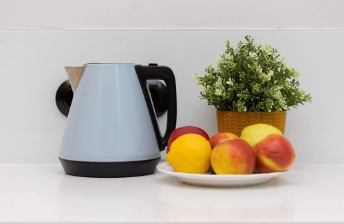 table with 4 chairs, refrigerator with freezer, induction cooktop, oven with microwave option, dishwasher, coffee maker, electric kettle, toaster, glasses, set of pots, cutlery, frying pan