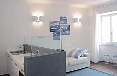 apartment with 2 dblbedrooms, walls covered with stamps reproducing marine images.Two bathroom furnished with mosaic and stone materials (Pietra Bucine).Complete kitchen with dishing machine and oven. Ecologic leather sofa for your relax. TV-Sat flat screen, table made of Carrara marble.Washing machine.Air conditioning. teak parquet