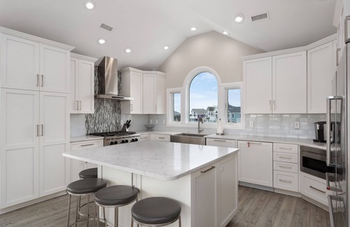 after a day of sun, sand and surf, come home and unwind in the thoughtfully designed and tastefully furnished great room The reverse floorplan, vaulted ceilings and wall of east-facing windows make the most of the horizon ocean views. Chill your bottles in the wine fridge before curling up in front of the cozy electric fireplace. Both the living and dining areas lead out to a spacious sun deck with barefoot-friendly Trex decking. Back inside, the open-concept layout and stylish LVP flooring tie the common areas together for a cohesive look with excellent flow. The chef in your group will appreciate the remodeled gourmet kitchen with large center island, quartz countertops and top-of-the-line appliances including a six-burner gas range. Two refrigerators and two dishwashers make cooking and clean-up for large groups a breeze. The primary suite is also located on the top level and features a spa-like bath with dual vanities and custom tiled shower with rainfall showerhead. The mid-level consists of a den with TV and four additional bedrooms - all ensuite for plenty of privacy. Downstairs you'll find two more bedrooms, as well as a rec room with pool table and convenient access to the backyard oasis where you can cool off in the saltwater pool or soak in the hot tub. After dark, gather your family and friends around the fire pit to share stories, tell jokes and make memories under the stars.