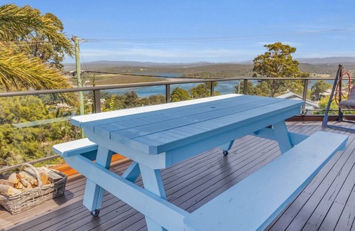 Merimbula Heights 1 is a coastal-style holiday accommodation. This self-contained property features two spacious bedrooms, one bathroom, and a modern, fully equipped kitchen that seamlessly connects to the open-plan living and dining areas. The expansive wraparound balcony, accessible through full-length glass sliding doors, offers stunning ocean and lake views, enhancing the indoor-outdoor living experience. Amenities include a 65-inch smart TV, Wi-Fi, Foxtel, a gas log fire, and reverse cycle air conditioning. Guests have access to communal gardens, a large outdoor BBQ area, and parking facilities comprising a shared garage space and driveway spot. This accommodation is ideal for couples or small families seeking a comfortable and scenic getaway.