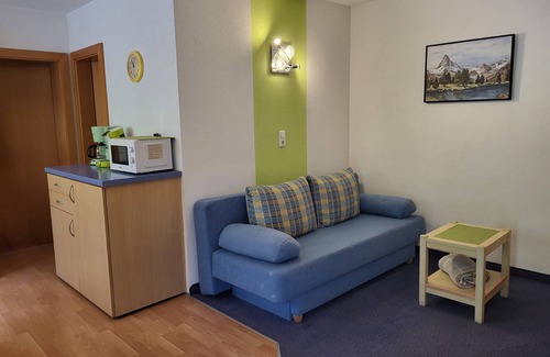 "michael", 2-room apartment 40 m2, on the ground floor Bright, modern furnishings: living/sleeping room with 1 double sofabed (155 cm), dining nook, satellite TV and radio. 1 double bedroom. Open kitchen (4 hot plates, oven, dishwasher, toaster, kettle, microwave, electric coffee machine). Shower/WC. Heating. Carpet. Patio. Barbecue (portable). Facilities: children's high chair, baby cot. Internet (WiFi, free). Please note: non-smokers only. Maximum 1 pet/ dog allowed. Private entrance, fire extinguisher.