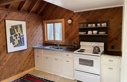 whether you are looking for a getaway by yourself, as a couple or with your entire family, we can accommodate you The A-frame provides sleeping arrangements for 2 adults. The first floor has an eat-in kitchen, sunken living room with wood burning stove, and a bedroom loft (accessible via a ladder/stairs -must be able to navigate a steep climb to bed) with a queen-sized bed and private bath. Additional amenities include a Smart TV, games, and microwave..