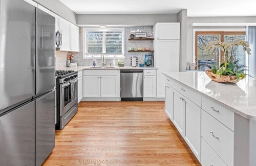 this remodeled multi-level split style home features a relaxing family room on the main floor complete with a fireplace Just a few steps up will lead you to the wide open living space where the kitchen and dining room are located. You can step onto the deck directly from the dining room to enjoy the private backyard. There are 4 bedrooms total with 3 bedrooms on the upper most level and 1 bedroom in the lowest level with its own living room right outside of it. The owner’s suite has a private half bathroom, the main upper level bathroom is complete with a tub and shower, and the main floor has a walk-in shower. You will find fresh fluffy towels all around the home. The kitchen is stocked with essentials for your stay. Laundry is available on-site as well as an attached 2 car garage.