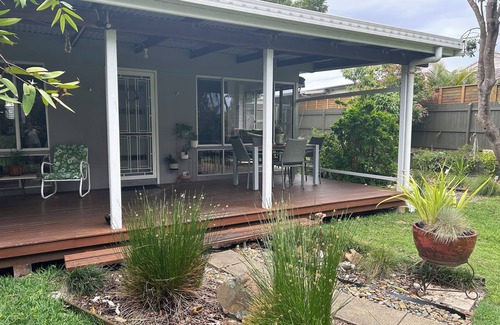 the front deck provides a bbq & outdoor furniture and overlooks the private, leafy garden and lovely grassed lawn for kids to play or just to laze around on Hang the hammock in the trees and kick back.