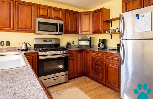 cozy up around the wood stove in the living room to watch tv or play games in the living room The open kitchen is a great spot to gather while preparing your home cooked meals, or order out from a variety of nearby restaurants. French doors leading to the deck and yard beyond. Pull some chairs next to the gully to listen to the water flowing in the Spring and Fall.