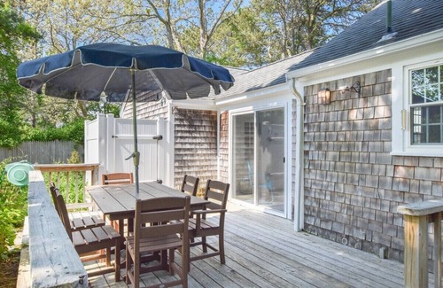 a classic cape house with a large backyard, deck, and just minutes from the nantucket sound beaches; this ideal location awaits for 6 guests Just under a mile from the home is Parkers River Beach, a local beach perfect for a quick dip and sunbathing. One mile further brings you to the mouth of the Bass River, a perfect place to watch the boats pass with your toes in the sand. Across the Bass River is West Dennis beach, another prime spot for relaxing and sunbathing, or taking a stroll along the 1+ mile stretch of sand. Inside the home, 3 bedrooms offer space for 6 guests, along with 2 full bathrooms, eat-in kitchen, living area, a sunroom breezeway, and a decked area outside with a propane grill. Two of the larger bedrooms each have a Queen bed, and the third bedroom offers two twin bunk beds. The living room offers comfortable seating and a flat screen Smart TV with cable and streaming, so you can enjoy a movie night, or catch up on the news and weather in the morning. Outdoor dining seating provides a wonderful space to relax and enjoy the evenings, a fire pit to cozy up to as the sun sets, and an outdoor shower provides an ideal place to rinse off after a day in the sun and sand.