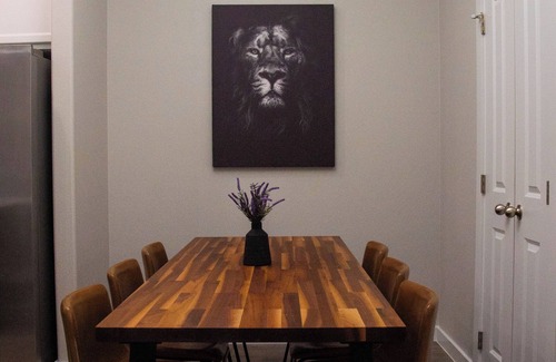 enjoy your stay in this beautiful luxurious home minutes to amenities and attractions SUPER FAST Wifi Fiber Internet. Living room area has a gorgeous leather reclining sofa with Smart Tv for your relaxing and viewing pleasure. There is also a modern executive desk for those traveling for work. A open design kitchen with gorgeous quartz countertops fully stocked for the chef within. 3 beautiful decorated spacious bedrooms and 2 full bathrooms with a fenced in backyard for pets and privacy. did we mention location and close proximity to nearly everywhere in town? restaurants and shops are only a 5 minute drive away!