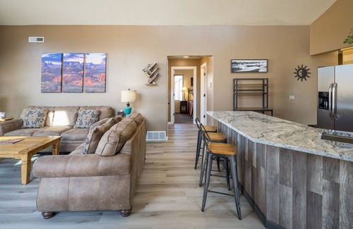 Our open concept, single-level townhome is conveniently located just a five minute drive from downtown Moab in the quiet Rim Village complex. Avoid the traffic and noise of downtown! The Rim Village development offers private, quiet and beautifully landscaped adobe townhomes with walkable streetscape and amenities like the community pool (open April - October). you'll quickly understand why it's a highly desirable lodging location while visiting the moab area!