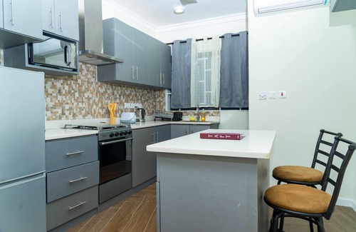 the modern ike apartment homes are located on a secure and gated compound manned by 24/7 private security The IKE property consists of four (4) fully furnished air-conditioned apartment homes. Each IKE apartment home has two (2) ensuite bedrooms with queen size beds, a fully equipped kitchen and island to prepare and eat meals, a separate dining area, as well as a living room with sofa and cable TV. Each apartment home also offers a half bath, Wi-Fi, backup solar power, a patio, and intercom phones to communicate within the compound, a separate laundry room with washing machine, access to clothes drying line, an iron and ironing board. Each apartment home can accommodate up to four (4) guests.