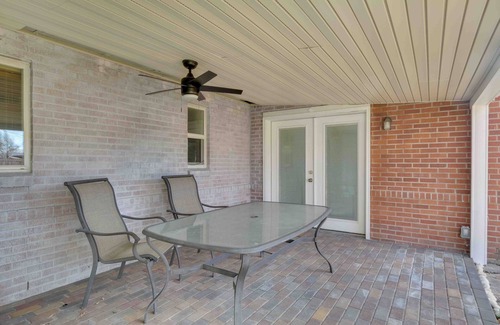 - back patio with dining area and fan Huge backyard.