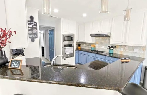 the fully equipped kitchen features stainless steel appliances (including a double oven), ample counter space, and a suite of ninja small appliances—blender, coffee maker, air fryer, multi-cooker, crockpot, and popcorn maker Dine at the spacious bar with stools or, by request, convert the formal dining room (currently an office) into seating for 6–8 guests.