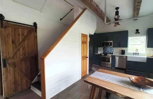 the open-concept living area boasts eleven foot high ceilings with barn bean accents, plenty of windows, unique glass garage door in the living space that allows the outside in and stylish décor, creating a bright and inviting atmosphere Relax in the cozy living room, complete with plush seating, 58 inch 4k TV, and a wood burning stove for those chilly evenings. The fully equipped glamour kitchen with quartz counter tops and custom built cabinets is perfect for preparing delicious meals, featuring all modern appliances and ample counter space.