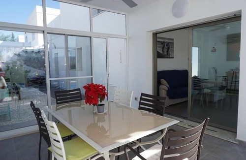 Beautiful modern villa, very spacious and well equipped. On a private, fully fenced plot with a large 8 x 4 m pool. A few meters from the center. The non-smoking chalet is perfect for 4 people.The villa is spread over two floors. The ground floor offers a spacious living-dining room, a well-equipped independent kitchen with access to the outside and a bathroom with a shower. From the living room there is access to the pool area and the nicely furnished sunroom with also access to the pool area. The upper floor is distributed with 2 double bedrooms (one with a 150 cm bed and the other 180 cm), each with a private terrace, and a bathroom with a bathtub. The plot is completely fenced and the pool offers the perfect space to cool off and lie down. It also has an electric gate and a large carport to park several cars. The chalet is fully furnished and perfectly equipped with everything you need for a vacation near the beach; washing machine, dishwasher, oven, microwave, fridge-freezer, garden furniture, sun loungers, outdoor shower (hot/cold), etc. There is hot / cold air conditioning throughout the house (bedrooms and living room), there is also Spanish TV and Astra Satellite. Quiet location a few meters from shops and restaurants. There are several supermarkets within 1'4 km, several restaurants and bars within walking distance from 400 m. The center of the town Els Poblets is located 1.2 km from the chalet. There you will find all the products of each day; various shops, supermarket, restaurants, bars, pharmacy, etc. The beach is approximately 1,500 meters away. Denia's town centre can be reached by car easily within 10-15 minutes. Denia and its environments provide a very good infrastructure and a huge offer of leisure activities, a mondern Marina and a fishing port, an attractive historic centre and an enormous choice of good restaurants. Last but not least an interesting night live! The diversified 20 km long sandy beach offers something for everyone, water sport activities, calm areas, beach bars, cliffy bays in the nature reserve, great for diving and snorkeling. Denia is situated exactely between Valencia and Alicante, both airports are at about 1 hour driving by car. Within 20 minutes to max. 1 hour you can reach several other lovely places on the coast, i.e. Javea, Calpe, Altea, Benidorm, an Alicante in the south, as well as Oliva, Gandia and Valencia in the north. Also a trip to the back country is worth to do, you will see lots of orange groves, almond trees and quaint villages between green hills and mountains. There are 2 renowned golf courses at only 10 km from the villa: La Sella and Oliva Nova Golf..
