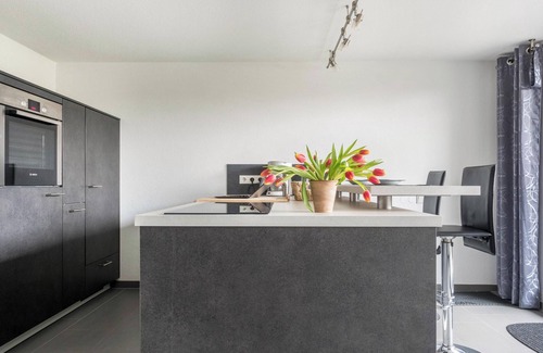 The modern and stylish apartment Steg 1 is located in Moos am Bodensee in the basement of a house that borders on idyllic fields. The quiet apartment consists of a light-flooded living room, a very well-equipped kitchen with a cooking island, a bedroom as well as a bathroom and can therefore accommodate 2 people. Amenities also include Wi-Fi, fans, a ping-pong table and satellite TV. The outdoor area with its garden, pond and seating area allows you to spend relaxing hours and start the day together at the table with breakfast. Shops, restaurants, bars and cafés are within 580 m and the next beach, Strandbad Moos, is 1.5 km (5-minute drive) away.