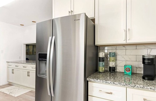 • kitchen with everything you need to cook, bake, and dine It features all-new stainless steel appliances, including a refrigerator, stove, and oven, as well as a coffee maker for your morning coffee. The kitchen is stocked with cooking and dining essentials, such as knives and cutting boards, pots and pans, and necessary utensils. With all these amenities, you'll have everything you need to prepare delicious meals for you and your group.