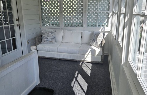 this carriage house is newly renovated! when you enter the unit you can enjoy this quant sunroom to relax and unwind Fully equipped kitchen, dining area with table and chairs, brand new furniture throughout, 50" Roku Tv and internet. Bathroom with rain shower head, laundry room with washer and dryer, and a cozy bedroom with a queen size day bed..