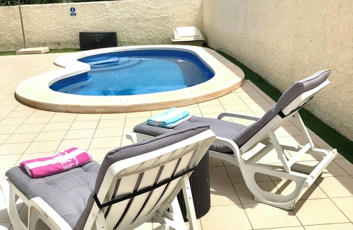the large outside area offers plenty of space to relax and sunbath It has its own private 6x3 swimming pool, so if you are feeling a bit hot you can cool off by taking a dip/ swim. There are sunbeds and a table with 6 chairs and a parasol to keep the sun off you. Also a nice comfy rattan sofa and chairs in the shade under the awning.