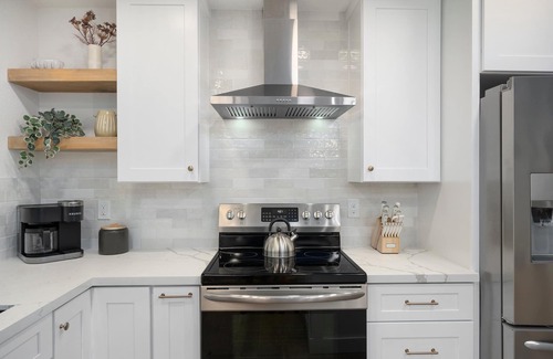 the kitchen is equipped with the essentials for your stay It features brand-new appliances and bar-seating for 3. There is a coffee maker, toaster, glasswares, plates, cups, utensils, etc. all available for your use. The dining table is a few steps from the kitchen and features seating for 8.