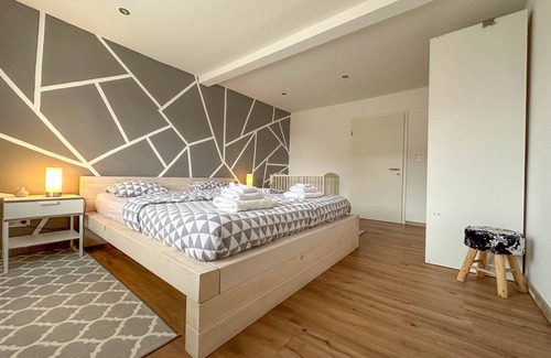 this modern corner house is modernly furnished The holiday home in a quiet village near the Moselle. A supermarket is around the corner. You can park cars or motorbikes in front of the house for free. Bicycles can be safely put inside, with charging facilities for e-bikes available. The house has a well-equipped kitchen. The living room is equipped with a cosy pallet stove and a flat-screen TV. in short, this house is an ideal base for a group to explore the beautiful eifel and moselle region
