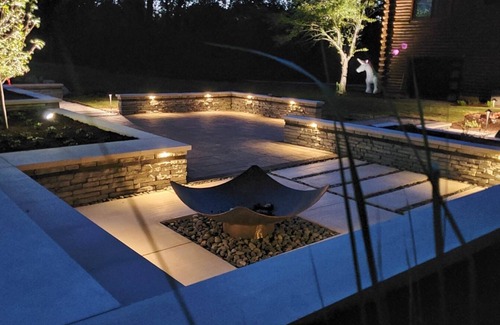 outdoors are professionally and beautifully landscaped and lighted with outdoor hot tub, fountain with fire feature, wood fire pit, grill and patios