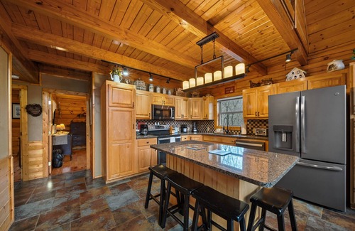 spanning three levels, this spacious and inviting log cabin exudes rustic mountain charm with rich wood accents throughout The main floor living room is a cozy retreat, featuring a wall of windows that flood the space with natural light, leather furniture arranged around a wood-burning fireplace, and a warm ambiance perfect for gatherings. The fully equipped kitchen boasts all stainless steel appliances, a large island, and ample space for preparing family meals. The dining table comfortably seats a full house, making it easy to enjoy meals together before heading out to explore.