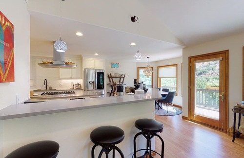 Gorgeous, modern, mountain home on the Roaring Fork River in Glenwood Springs, Colorado. 40 miles to Aspen, 60 miles to Vail and only 10 miles to our local mountain, Sunlight Ski Resort. With Gold Medal Waters right in our own backyard, our beautiful home is perfect for fly fishing & rafting. Like to bike ride? So do we. There’s a bike path directly from our backyard or the Rio Grande Bike trail, is a mile away and goes all the way to Aspen. Our home is divided between two living spaces. You will have the entire main floor suite (street level entry) to yourselves and it’s securely locked off from the downstairs owners suite. The large master bedroom has a king size bed, bedside tables, dresser drawers, a seating area and access to your own private outside deck with lounge chairs. The in-suite bathroom has a shower, 2 person jacuzzi tub and two sinks. You'll have private access to our chefs kitchen that has a Viking stovetop, All Clad cookware and plenty of dishes and serving pieces. The kitchen, dining room and living room have large glass windows with panoramic views of our gorgeous mountains. Our backyard has a million dollar view and faces the gorgeous red rock mountains. From the outside deck look south and see the majestic Mt Sopris mountain. At night, grab a blanket, your favorite beverage and sit on our deck and watch the stars. Need to get some work done? Use the desk in the guest bedroom. It's a quiet place to work with French doors that open up to a lovely seating area in the front courtyard. There is a propane BBQ grill on the deck. STR #23-018.