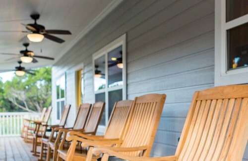 “the ranch house” has a two story great room with a large gathering table (seats up to 14 and more at the kitchen bar) and a covered porch lined with rocking chairs to enjoy morning coffee There are 2 outdoor farm tables in front of the porch. The large fire pit is perfect for gathering family and friends.