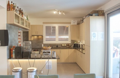 inside, the ground floor features a fully equipped open-plan kitchen with a large fridge, washing machine, dishwasher, oven, stovetop, and various kitchen appliances that leave nothing to be desired Right next to it is the dining area with a table for eight and a cozy living room with a 65-inch LED smart TV, a comfortable sofa, and a desk. A special highlight is the private gym, equipped with a treadmill, exercise bike, leg press, incline bench, lat pulldown, Smith machine, front & hack squat station, plenty of weights, and a 42-inch smart TV.