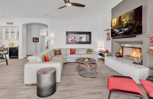 resort-inspired backyard: take a dip in the sparkling pool surrounded by lush, mature landscaping, blooming bougainvillea, and colorful cacti Enjoy outdoor dining and lounge areas, a cozy fireplace for cool evenings, a putting green for golf lovers, and yard games for everyone.