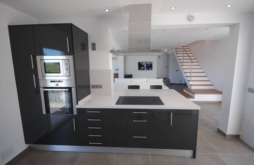 the villa is open plan and is styled in a modern, minimalist theme with leather sofa, dining table for 6, fully fitted kitchen with island hob, large american fridge with all the mod-cons There is a 50 inch LED TV in the living room and 32 inch LED TV's in every bedroom, all with SKY Digital freeview TV. There is also complimentary fibre optic hi-speed WIFI for all guests.