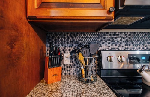 cook and gather with ease in the fully equipped kitchen, stocked with cookware, utensils, and modern appliances including a stove, oven, microwave, refrigerator, dishwasher, and coffee maker A spacious dining table is perfect for family meals or game nights, while bar seating provides a casual spot for coffee or snacks. Essentials like coffee and tea are included.