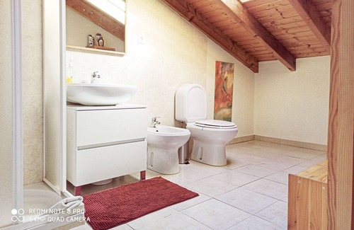 the apartment is on the 2nd floor of the building and has two floors On the ground floor is the kitchen, living, two bedrooms and bathroom. On the second floor there is a large, comfortable bedroom with private bathroom. This bedroom is huge and super cozy with its wood floor and ceiling. It accommodates two persons in a double bed plus three persons in individual beds.