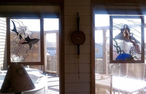 the moonstruck mermaid is owned by two artists who come to the home frequently to get inspiration for their glass and quilt art You will see examples of their art throughout the house. The home has hardwood and ceramic tile flooring with cedar ceilings and walls throughout. As soon as you walk thru the door into the gathering room of the home your shoulders will feel lighter. The Moonstruck Mermaid has both a living room and a gathering room with game table. Our guests have enjoyed being able to watch a movie in one room and listen to music in the other. We provide HBO, Showtime, Cinemax, and On Demand for those evenings when it feels so good to just kick back and be entertained. The gathering room has a cedar cathedral ceiling with three skylights; you can watch the moon travel across the evening sky thru the skylights. There is a wall mounted 50' HDTV with DVD player. This room also has a full size sleeper sofa that will comfortably sleep two, two leather recliners and a game table. Further there is a wet bar fully stocked with glassware, cocktail shakers, ice bucket, etc. Also there is a half bath off this room and an outside courtyard with morning sun.